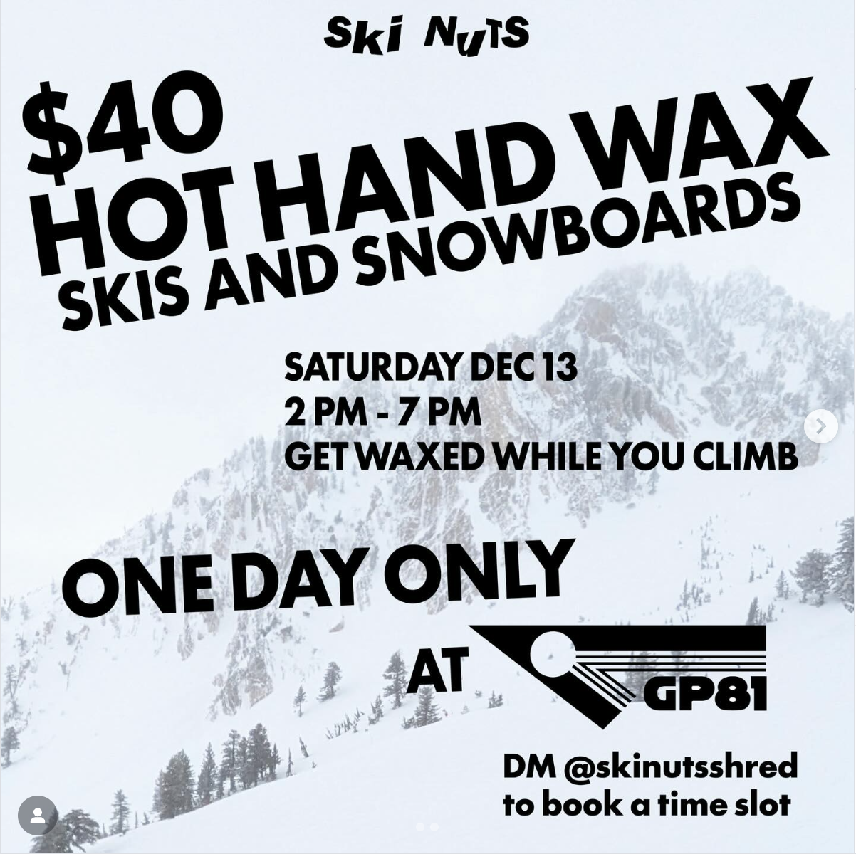 ONE DAY ONLY.. bring your skis and boards to GP81 on SATURDAY, DEC 13 for a hot hand wax 🔥